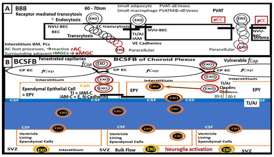 Illustration of the PVAT-derived exosomes (PVAT-dEVexos) passing the blood–brain barrier (BBB) and the blood-cerebrospinal fluid barrier (BCSFB). (A) depicts the adipocyte perivascular adipose tissue-derived extracellular exosomes (PVAT-dEVexos) and the perivascular adipose tissue macrophage-derived extracellular exosomes (PVATMΦ-dEVexos) passing the BBB neurovascular unit (NVU) brain endothelial cell(s) (BEC) via receptor mediated endocytosis and transcytosis and the paracellular tight/adherens junctions (TJ/AJ). Importantly, the passage of exosomes via the paracellular junctional regions is enhanced in the presence of peripheral cytokine/chemokines (pCC) that will be elevated via the macrophage inflammation from the PVAT (outlined in red) and may contribute to the impairment of paracellular junctions. (B) demonstrates the passage of PVAT-dEVexos and PVATMΦ-dEVexos (black center outlined in orange) via the more vulnerable fenestrated capillaries of the choroid plexus (CP) endothelial cell(s) (EC) into the interstitial stromal regions to enter the basilar ependymal cells (EPY) of the BCSFB. Here, the exosomes may result in the activation of the epithelial ependymal cells (EPY)-derived (blackened exosomes lined by orange color) (EPY-dEVexos) that will be secreted into the cerebrospinal fluid (CSF) and pass through the CSF via a streaming effect to be eventually taken up by CSF ventricle lining EPY cells to be delivered to the interstitial fluid space of the subventricular zones (SVZ) (blackened center with golden outline) and be capable of activating the neuroglia microglia cells which activated the astrocytes to form reactive astrocytes with resulting remodeling astrogliosis and the activation of central nervous system cytokines and chemokines with ongoing neuroinflammation as they flow through the interstitial fluid space via bulk flow. AC = astrocyte(s); aMGC = activated microglia cell(s); BM = basement membrane; EXO = exosome(s); JAM-C = junctional adherens molecule-C; JAM-C = E or N Cadherens; rAC = reactive astrocytes; rMGC = reactive microglia cell(s) or aMGCs; TJ/AJ = tight and adherens junctions; ZO-1= zona occludens-1.