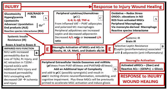 Possible sequence of events leading to neuroglia activation, neuroinflammation, brain remodeling, and impaired cognition due to descending thoracic aorta perivascular tissue (PVAT)-derived adipocyte and macrophage extracellular vesicle exosomes (EVexos) (A–E). This schematic illustration suggests that an injury and response to injury wound healing mechanism is present in the central nervous system (CNS) [62]. Further, this injury would be induced by perivascular adipose tissue (PVAT) inflammation and dysregulation of peripheral adipokines (increased proinflammatory leptin and decreased anti-inflammatory adiponectin), and peripheral cytokines and chemokines (pCC). Increase pCC would activate the CNS ramified microglia cells (rMGCs) to undergo polarization to an M1-like ameboid activated (aMGC) proinflammatory phenotype, while the astrocytes (ACs) would become reactive, proinflammatory phenotypes (rAC) and result in pathological astrogliosis. Furthermore, neuroglia activation would result in an ongoing chronic neuroinflammation with increased central nervous system cytokines/chemokines (cnsCC) production associated with cellular and brain remodeling in a response to injury mechanism with ensuing impaired cognition. Additionally, rAC detachment, retraction, and separation from the NVU will result in NVU uncoupling and decreased regional cerebral blood flow (CBF) and ischemia, which would also result in injury and a response to injury wound healing mechanism. Note that boxes A–D all lead to the final outcome of neuroglia activation in the central box E. While the possible sequence of events has been denoted in sequential lettering (A–E), it is likely that each of these injuries and response to injuries is occurring concurrently rather than occurring in a hard and fast sequence of (A–E). A = adiponectin; AGE/RAGE = advanced glycation end products and its receptor; CBF = cerebral blood flow; ecGCx = endothelial cell glycocalyx; GFAP = glial fibrillary acidic protein; iba1 = ionized calcium binding adaptor molecule1; IL- 1β = interleukin-1 beta; IL- 6 = interleukin- 6; IR = insulin receptor; L = leptin; LR = leptin resistance; miRNA(s) = micro ribonucleic acid(s); NO = nitric oxide; NVU = neurovascular unit; O2.- = superoxide; ONOO- = peroxinitrite; Pc = pericyte; ROS = reactive oxygen species; T2DM = type 2 diabetes mellitus; TJ/AJ = tight and adherens junctions; TNFα = tumor necrosis alpha.
