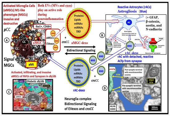 Peripheral extracellular exosomes (EVexos) that include adipocyte PVAT-dEVexos, macrophage PVATMΦ-EVexos, and peripheral cytokines/chemokines (pCC) are capable of activating central nervous system (CNS) microglia (aMGCs) with microgliosis and bidirectional signaling with astrocytes. In turn these aMGCs undergo bidirectional crosstalk signaling with astrocytes (AC) that result in reactive astrocytes (rACs) and astrogliosis via cnsEVexos and cnsCC. Subsequently, these rACs are capable of signaling MGCs into becoming aMGCs and reinforce this vicious cycling resulting in neuroinflammation, CNS remodeling, and impaired cognition. Representative transmission electron microscopic images of aMGC (A), rAC (B), encroaching aMGC of neurovascular unit (C), and detached rAC from neuronal synapse (D). These modified transmission electron microscopic images are provided with permission by CC 4.0 [32,33,36]. AC-dEVexo = astrocyte derived exosomes; aMGC = activated microglia cell; aMt = aberrant mitochondria; CC = chromatin condensation; cnsCC = central nervous cytokines/chemokines; CD68 = cluster of differentiation 68; dAFfp = detached astrocyte foot process(es); EV = extracellular vesicles; exos = exosomes; GFAP = glial fibrillary acidic protein; iba1 = ionized calcium-binding adapter molecule 1; MGC(s) = microglia cells; MΦ = macrophage; mRNA = messenger ribonucleic acid; miRNA = micro ribonucleic acid; MVs = microvesicles; N = nucleus; PVAT = perivascular adipose tissue; PostS = post synaptic neuron; PreS = presynaptic neuron; PSD = postsynaptic density; RBC = red blood cell; TBD = to be determined.
