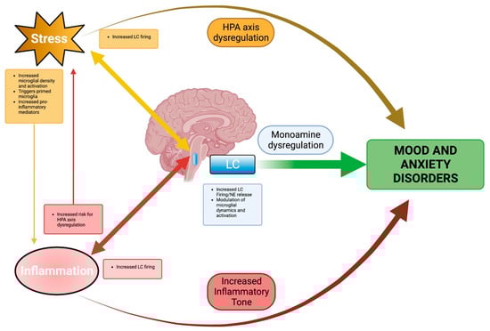 Despite their distinct and complex clinical phenotypes, similar risk factors have been identified, such as genetics, sex, environment, and stress exposure. In both disorders, women show a higher diagnosis prevalence than men [14]. Barring social differences, such as coping styles and attitudes towards mental health, women still demonstrate a higher prevalence than males, suggesting a biological effect of sex in increasing the risk of mood or anxiety disorder diagnosis [15,16]. Similarly, a family member’s mood or anxiety disorder diagnosis increases the likelihood of future diagnosis [17]. While genetics contribute to the increased likelihood of a future diagnosis, family history risk factors could include negative parenting styles and traumatic childhood experiences from living with a diagnosed caregiver [18,19]. Indeed, stress exposure through trauma is a well-studied risk factor in the emergence of mood and anxiety disorders [20,21]. Remarkably, a significant correlation exists between the onset of major depression and life-changing events in the previous three months [22]. More recently, studies have demonstrated the emergence of another biological risk factor: inflammation. Patients diagnosed with mood or anxiety disorders show increased levels of peripheral inflammation [23,24]. Together, these similarities provide clues as to the complex etiology of mood and anxiety disorders. While identifying the contributions of each risk factor is complex, considering both as reciprocally-interacting effectors of disease can enhance understanding of disease etiology and lead to better treatments. This review presents an integrated perspective wherein stress exposure, LC–NE dysfunction, and inflammation interact in mood and anxiety disorders. By emphasizing the complex reciprocal interactions between known risk factors in mood and anxiety disorders, we propose that LC represents a unique anatomic site whose integration of pro-stress and pro-inflammatory cues makes it uniquely positioned to contribute to the etiology of mood and anxiety disorders through neuronal and non-neuronal mechanisms.