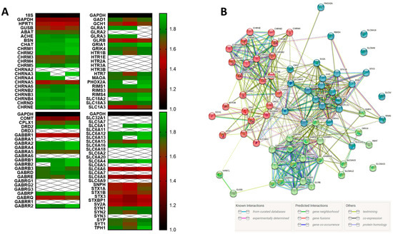 The search tool for the retrieval of interacting genes/proteins (or STRING analysis) allows for the prediction of gene co-occurrence and interrelationships using informational theory and existing databases, and can quantify this information to provide models of gene interactions [23]. STRING analysis of the qRT-PCR transcripts revealed three main clusters of neuroreceptor- and neurotransmitter-associated genes expressed by HMC3 that were enriched in acetylcholine receptor subunits, GABAR subunits, and syntaxins (Figure 1B). These gene clusters were associated with specific biological processes and molecular functions such as synaptic transmission, GABA biosynthesis, GABA secretion, and GABA import (Table 1).