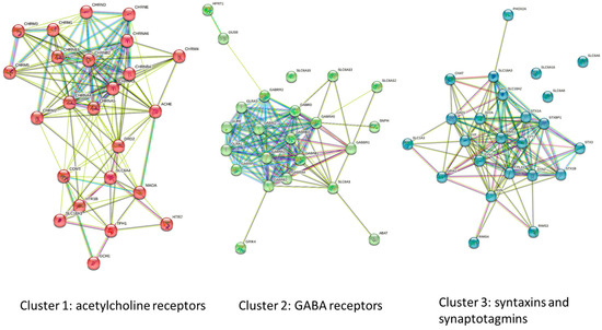 Further analysis of the three gene clusters indicated variable degrees of association between its members, with cluster 1 (acetylcholine receptor subunits) clustered strongly around CHRNA3 (which encodes for the neuronal acetylcholine receptor subunit alpha-3 protein) and had a clustering coefficient of 0.783 (Figure 2). By comparison, cluster 3, containing the syntaxins and synaptotagmins was similar with a clustering coefficient of 0.73. The GABAR cluster had the highest co-occurrence (clustering coefficient of 0.825), and showed a high degree of association between GABRA2, GABRA3, GABRA4, GABRA5, GABABR1, and GABRB3, all encoding for α2, α3, α4, α5, β1, and β3 subunits of the GABAAR.