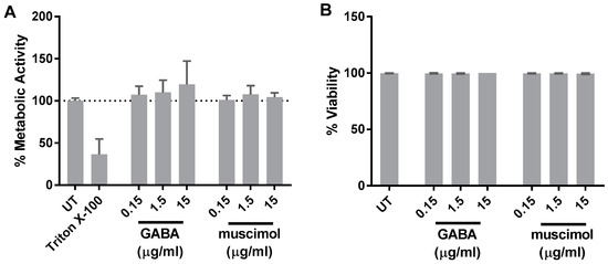 GABA and muscimol effects on metabolic activity and viability. HMC3 was treated with 0.15–15 µg/mL GABA and muscimol for 24 h and metabolic activity was measured via (A) XTT assay and (B) trypan blue exclusion assay. Untreated (UT) and triton-X-100-treated cells were used as negative and positive control, respectively. Data were analyzed by one-way ANOVA with Tukey post hoc analysis and are presented as mean ± SEM of n = 3).