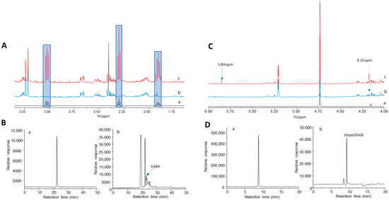 Our previously published data identified some typical metabolites in AME-1 by 1H NMR-based metabolite profiling, suggesting the presence of GABA [15]. To determine whether GABA or muscimol were present in AME-1, we performed spiking NMR experiments and HPLC analysis (Figure 7A–D). Although the signals for GABA and muscimol were very weak, the presence of GABA and muscimol was observed. NMR profiling results indicated that the concentrations of GABA and muscimol in AME-1 were 0.30 and 4.4 mM (Supplementary Table S1). There is more muscimol than GABA in AME-1 because the muscimol signals (4.16 and 5.84 ppm) were much larger than the GABA signal in the 1H NMR spectra (Figure 7(Ab,Cb)).