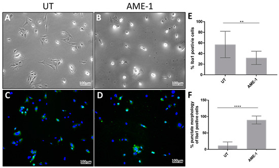 Immunofluorescent analysis indicated that Iba1 expression was diffuse throughout the cytoplasm in untreated cells, with the majority of cells (approximately 60%) displaying bright Iba1-associated fluorescence (Figure 8C). AME-1 treatment appeared to decrease the percentage of cell positive for Iba1 but significantly increased the number of cells with punctate Iba1 localization, particularly around the nuclei (Figure 8D). In some cells, the punctate expression was strongly associated with the DAPI-stained nucleus. In summary, the effect of AME-1 on Iba1 localization was similar to the effect of muscimol (Figure 3F,H) but more pronounced with many more cells showing the punctate localization of Iba1 around the nucleus.