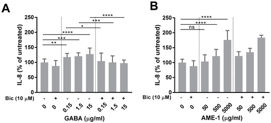 Effect of bicuculline on AME-1 production of IL-8. HMC3 was treated with 10 µM bicuculline (bic) for 1 h and subsequently treated with 50–5000 µg/mL AME-1, 0.15–15 µg/mL GABA, or left untreated for 24 h. Bicuculline, AME-1, and GABA treatments alone were used as controls. (A) Bicuculline does not inhibit AME-1 IL-8 production. (B) Bicuculline inhibits GABA-induced IL-8 production. Data were analyzed by two-way ANOVA with Tukey post hoc analysis and are presented as mean ± SEM of n = 3, p ≤ 0.05 (*), p ≤ 0.01 (**), p ≤ 0.001 (***), p ≤ 0.0001 (****), ns = not statistically significant.