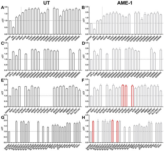 AME-1 modulates the expression of neuroreceptors and associated enzymes. HMC3 were either untrated (UT) or treated with AME-1 (500 mg/mL for 3 h) and RNA was isolated. Three independently isolated RNA samples were analyzed for the expression of over 80 gene transcripts using qRT-PCR. Data for untreated (A,C,E,G) and AME-1-treated samples (B,D,F,H) are presented as average delta Ct (critical threshold) for all three samples: expression of each gene relative to GAPDH expression for each cDNA sample (n = 3 independently generated samples from three independent treatments). Red bars indicate genes that were absent in untreated cells but expressed in AME-1-treated cells.