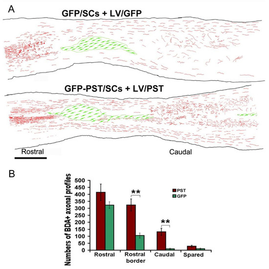 As many of the weakly BDA-labelled axons, especially those thin axonal sprouts, were difficult to see clearly in the montaged images (Figure 3A,B), composite figures of camera lucida drawings based on four sections from one rat in the GFP group and one from the PST group were generated to provide a direct view of the BDA-labelled axonal profiles (Figure 4A). It is evident that many more BDA-labelled axonal profiles were present close to the rostral lesion border and in the grey matter caudal to the lesion. Quantification of BDA+ axonal profiles shows that there was no significant difference in the numbers of BDA+ axons at 8 mm rostral to the lesion border, indicating the BDA labelling efficiency was similar between the two groups. However, there were significantly more BDA+ axons at the rostral border in the PST group than that in the GFP group (324 ± 44 vs. 105 ± 18, p < 0.01) (Figure 4B). Similarly, there were significantly more BDA+ axonal profiles at 4 mm caudal to the lesion border in the PST group than in the GFP group (132 ± 25 vs. 10 ± 5, p < 0.01). To evaluate the sprouting axons further caudal to the lesion, we counted the BDA+ axons in the grey matter 20 mm caudal to the lesion border from four randomly chosen sections: 20 ± 4 axons were counted in the PST group and 1 ± 1 in the GFP group. The numbers of spared axons in the lateral funiculus at the level of the lesion center were not significantly different between the two groups (PST group: 29 ± 7 vs. GFP group: 10 ± 5, p > 0.05) (Figure 4B). Pearson correlation test shows that the numbers of BDA+ axonal profiles in the caudal spinal cord are closely correlated with the number of spared BDA+ axons (r = 0.98, p = 0.001) in the GFP group, but are not correlated in the PST group (r = 0.687, p = 0.132), indicating that a proportion of the BDA+ axons in the PST group was regenerating CST axons.