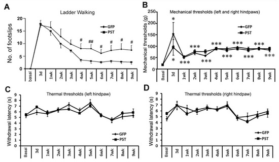 Motor and sensory functional tests. (A) Ladder crossing for motor functional test of the rat hindlimbs. The animals receiving transplantation of GFP/SCs plus LV/GFP injection made significantly more hindlimb slips while walking on the horizontal ladder in comparison with animals receiving transplantation of GFP and PST co-transduced SCs (GFP-PST/SCs) plus LV/PST injection. Data are presented as mean ± SEM. # p < 0.05, ## p < 0.01, compared between PST and GFP groups, two-way ANOVA, n = 7. (B) Von Frey test for tactile perception of the hindpaws. Hindpaw withdrawal thresholds increased significantly at post-injury day 3 in both GFP and PST groups. The mechanical thresholds recovered slightly one week after surgery but remained at a significantly elevated level until the end of the experiment. There is no significant difference in the mechanical thresholds between the PST and GFP groups during the period of the experiment. Data are presented as mean ± SEM. * p < 0.05, *** p < 0.001, compared with the base level before surgery (asterisks illustrating the statistical significance apply to both GFP and PST groups), two-way ANOVA, n = 7. (C,D) Hargreaves test for thermal nociception of hindpaws. Measurement of the mean latencies for thermal withdrawal thresholds of both hindpaws did not show significant changes to nociceptive thermal stimuli after dorsal column transection in both GFP and PST groups. There is also no significant difference in nociceptive thermal sensitivities between PST and GFP groups.