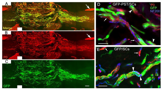 We examined the expression of peripheral myelin protein P0 as an indicator for myelination formed by SCs within the transplants (Figure 6). Although we showed the regenerating or sprouting CST axons did not grow deep into the SC transplants, other types of axons, such as serotonergic axons, can grow into the SC transplants (our unpublished data) [36,37]. P0 was highly expressed in GFP-PST/SCs (Figure 6A). Confocal images showed that GFP-PST/SCs (green in Figure 6D) and GFP/SCs (green in Figure 6E) formed P0+ internodes (red, arrowheads) around neurofilament+ axons (blue). Some P0+ internodes were formed by host SCs migrated into the transplants (arrows in Figure 6D,E). Calculation of the ratios of P0+/GFP+ internodes over GFP+ cells showed that the ratios were very close for the GFP-PST/SCs and GFP/SCs (0.56 ± 0.02 vs. 0.55 ± 0.06, p = 0.78), indicating that transplanted GFP-PST/SCs and GFP/SCs had a similar capacity of myelination. However, calculation of the ratios of P0+ cells (including both transplanted and host SCs migrated into the transplants) over P0+/GFP+ cells (representing transplanted GFP-PST/SCs or GFP/SCs) showed the ratio is much higher in the PST group than in the GFP group (2.7 ± 0.3 vs. 1.7 ± 0.2, p < 0.05), indicating that there was increased migration and myelination from host SCs in the PST group.