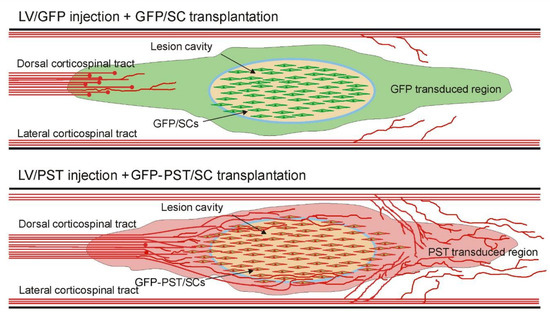 Schematic diagram showing the effects of combined transplantation of GFP- or PST-transduced Schwann cells with intraspinal injection of LV/GFP or LV/PST in promoting corticospinal tract axon regeneration and sprouting.