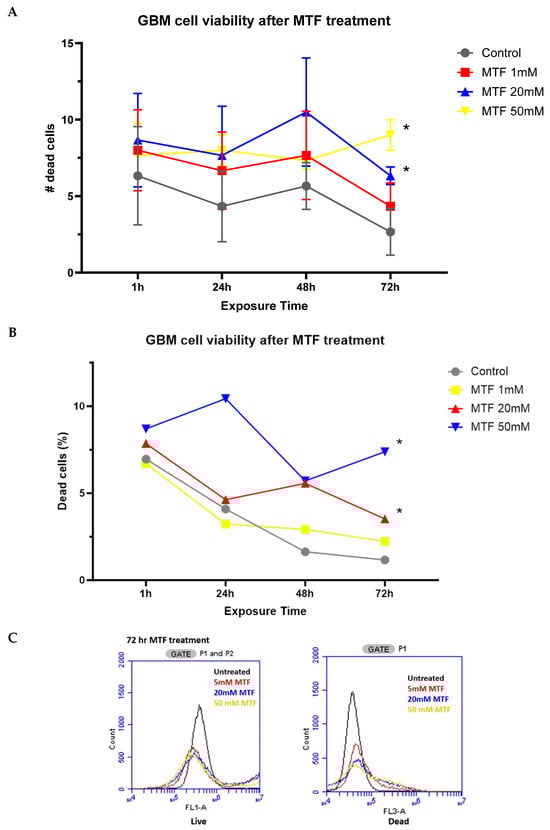 Quantitative data on the human GBM cell line (U87) (A) dead cell counts and (B) percentage of dead cells after exposure to MTF. The human GBM cell line (U87) was exposed to three different doses of MTF (1 mM, 20 mM, and 50 mM), and cell counts were performed at various time points (1, 24, 48, and 72 h). * p < 0.001 Two-way ANOVA. (C) Flow cytometry analysis of live vs. dead cells at 72 h after MTF treatment of U87 cells.