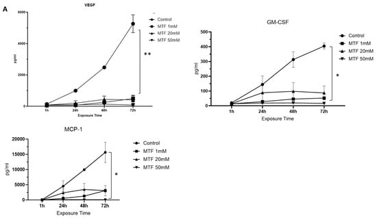 Immunomodulatory effect of MTF. Decreased secretion of mediators upon MTF exposure compared to control: (A) VEGF, GM-CSF, and MCP1. Decreased secretion of mediators upon exposure to 50 mM of MTF compared to control (B) IL-8, IL-1b, Eotaxin, G-CSF, and TNF-a. ANOVA * p < 0.05; ** p < 0.001.