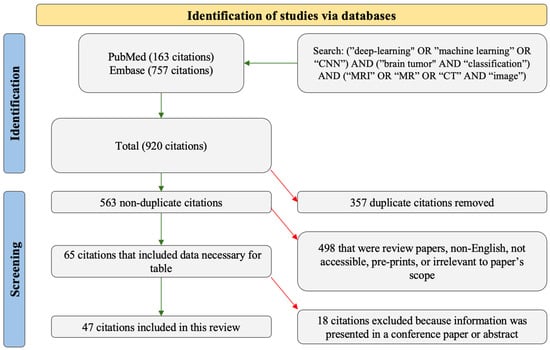 A systematic review was performed in accordance with the Preferred Reporting Items for Systematic Reviews and Meta-Analyses (PRISMA) guidelines. The main objective was to survey the types of model algorithms and evaluate subsequent accuracy metrics of studies that have utilized CNN to automate brain tumor classification. The PubMed, Embase, and Cochrane Library databases were queried from inception to 22 October 2023, with the following search criteria: (“deep learning” OR “machine learning”) AND “brain tumor” AND (“MRI” OR “MR” OR “CT”) AND “image classification” OR “brain tumor classification”). Studies published in the English language were included if they directly utilized CNN for the purposes of brain tumor classification. Studies were excluded if they did not utilize CNN or if they were review articles. There were no restrictions on publication date. Three authors (M.S.G., E.T., and T.S.) performed the database searches and screened the titles and abstracts for relevance in accordance with the inclusion and exclusion criteria. Any discrepancies were resolved by consensus among all authors. Eligible articles were pooled, and duplicates were removed. Full-text articles and their respective reference lists were reviewed for final study inclusion. Data were extracted from all eligible articles by four independent authors (M.S.G., E.T., T.S., and J.W) who utilized a preformed data extraction sheet to collect the following information: author name, year, brain tumor subtypes classified, model algorithm, accuracy (averaged if multiple models were used), dataset size, and dataset source. A total of 920 articles were identified through our systematic literature search (Figure 1). After screening, duplicate removal, and appraisal for relevancy, 47 articles were included for final review.