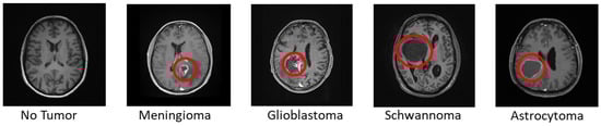 Brain tumor MRI image subtypes. Red circles outline respective tumor location.
