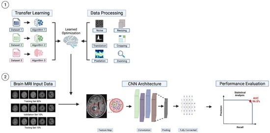Our workflow prioritized cost-effectiveness without sacrificing classification accuracy (Figure 3). To develop our cloud-based platform, we utilized Google Collaboratory, which allowed us to develop our code, leverage cloud-based Python notebooks, and harness supercomputing resources (Initially, we performed a series of learned optimizations to improve our model’s performance). We utilized various permutations of EfficientNet, BERT, Transformer, TensorFlow Hub, PyTorch Hub, ResNet-50, VGG-16, Inception V3, DenseNet201, Xception, MobilleNet, and ResNet to achieve the highest possible prediction capabilities [17]. To further optimize our BRAIN model, we implemented data processing and augmentation techniques as previously described in the literature [17,18,19,20,21]. We expanded our data by incorporating varying combinations of noise injection, pixelation, image translation, cropping, resizing, and zooming [17,19,20]. Our BRAIN workflow was able to automatically optimize our CNN model with the best possible combination of transfer learning and data augmentation features to provide the highest predictive accuracy for our classification task. Finally, to test the generalizability of our model, we tested BRAIN on two external datasets, each with distinct MRI parameters.