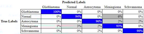 Performance of brain tumor classification (note: numbers may not add up to 100 due to rounding).