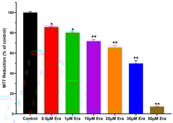 - Mosmann, T. Rapid Colorimetric Assay for Cellular Growth and Survival: Application to Proliferation and Cytotoxicity Assays. J. Immunol. Methods 1983, 65, 55–63. [Google Scholar] [CrossRef] [PubMed]