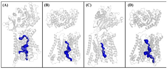 - Stourac, J.; Vavra, O.; Kokkonen, P.; Filipovic, J.; Pinto, G.; Brezovsky, J.; Damborsky, J.; Bednar, D. Caver Web 1.0: Identification of Tunnels and Channels in Proteins and Analysis of Ligand Transport. Nucleic Acids Res. 2019, 47, W414–W422. [Google Scholar] [CrossRef] [PubMed]