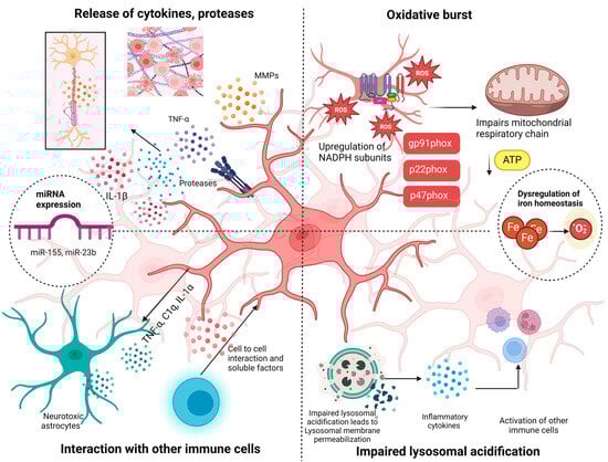Different ways microglia acts as a sabotaging agent: First, the release of cytokines and proteases like TNF α, IL-β, and MMPs causes ECM and myelin sheath degeneration. Second, the interaction with other immune cells leads to the development of neurotoxic astrocytes and an interaction with T cells, which elevates neuroinflammation. Third, impaired lysosomal acidification leads to lysosomal membrane permeabilization, releasing cathepsins and inflammatory cytokines and leading to the recruitment and activation of other immune cells. Fourth, the upregulation of NADPH subunits leads to oxidative stress, which causes impaired mitochondrial function and decreased ATP production. Other pathways include the expression of microRNA (miRNA), including miR-155 and miR23b, and the dysregulation of iron homeostasis. MMP (matrix metalloproteinase), NADPH (nicotinamide adenine dinucleotide phosphate), ROS (reactive oxygen species), TNF-α (tumor necrosis factor).