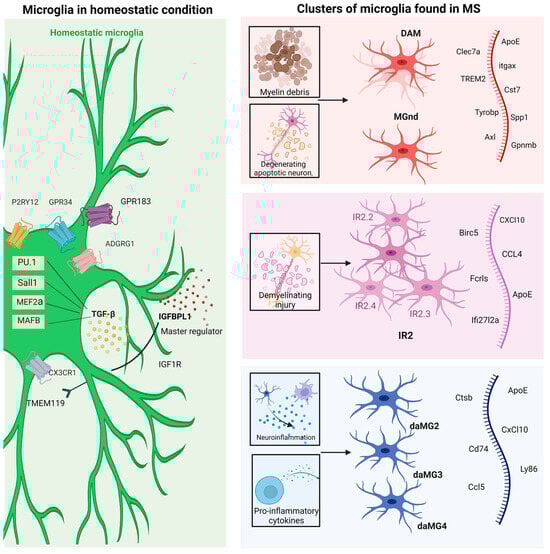 Transcriptional profile of homeostatic microglia and clusters of microglia found in MS. Homeostatic microglia with crucial transcription factors like PU.1, Sall1.MEF2a, and MAFB, whose signaling molecule is TGFβ. IGFBL1, also called master regulator, causes microglia to return to homeostasis. Other key homeostasis-associated genes are P2RY12, ADGRG1, P2RY13, CX3CR1, GPR34, and GPR183, which belong to the class of G protein-coupled receptors. Clusters and subclusters of microglia found in MS with their transcriptomic profile are damage-associated microglia (DAM), neurodegenerative-associated microglia (MGnd), injury-responsive microglia-2(IR2), and disease-associated microglia 2, 3, and 4 (daMG2, daMG3, daMG4).