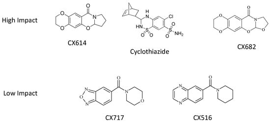 Chemical structures of high-impact and low-impact ampakines used in this study.
