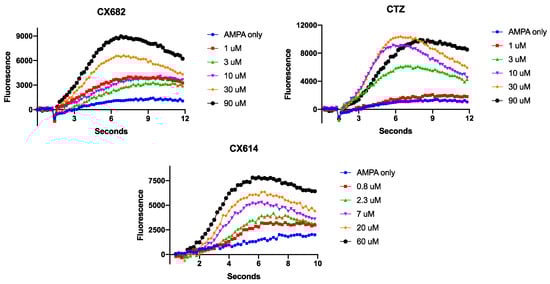 In these studies, we utilized two well-characterized, high-impact ampakines: CX614 and CTZ [39]. We also utilized the furan analogue of CX614, CX682 (Figure 1). The low-impact ampakines CX516 and CX717 [21,37,46,47,48] were also utilized as well (Figure 1). We previously showed that, in neurons, AMPA induced a rapid increase in cytosolic calcium levels that reached an asymptote 1–2 s after AMPA addition to the culture medium [43]. In astrocytes, we find that AMPA addition causes a slow rise in calcium levels, which plateaus ~5 s after AMPA addition. With the addition of CX682, CX614 or CTZ, the slope of the calcium elevation increased along with the total fluorescence at the end of the recording period (Figure 2). Two-way ANOVAs were used to evaluate the effects of each ampakine on fluorescence over time. For each ampakine, there was a significant effect of time on fluorescence (p < 0.0001). There was also a significant concentration-dependent increase in fluorescence (p < 0.0001). In addition, there was a significant interaction between time and treatment for the three high-impact ampakines evaluated (p < 0.0001). These preliminary findings demonstrate that neurons and astrocytes respond functionally differently to AMPAR agonists. It is also of interest that, in neurons, saturating concentrations of ampakines augmented AMPA-induced calcium rises by 150–180% [43], whereas, in astrocytes, these ampakines augment AMPA-induced calcium rises in excess of 500% (Figure 2). These data suggest that high-impact ampakines may exert a more robust effect on astrocytes in vivo. These data also suggest that high-impact ampakines can augment AMPA-induced cytosolic calcium elevations in astrocytes at concentrations that modulate neuronal AMPARs [39,49,50,51,52].