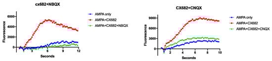 The protocol for fluorimetry experiments was described previously [43]. On the day of the experiment, the culture media was replaced with 100 μL media containing 2 µM Fluo-4-AM in CSS for 15 min at room temperature. The cells were then incubated with 100 μL fresh CSS for 5 to 10 min. The cells were then incubated with an additional 100 μL of CSS containing ampakine, with or without other investigational drugs. Cultures were then incubated for 30 min prior to initiating studies. Changes in Ca2+cyt were quantified by recording the fluctuation in light emission at 520 nm caused by excitation of the Fluo4-dye via a 485 nm light beam (Fluostar Galaxy fluorimeter, BMG Labs, Cary, NC, USA). Baseline fluorescence values were taken for 15–20 s at 0.1–0.2 s intervals and then studies were imitated by adding 10 μL of 100 μM (s)-AMPA to achieve a final concentration of 5 μM. Changes in fluorescence were then recorded for up to 15 s at 0.1–0.2 s intervals.