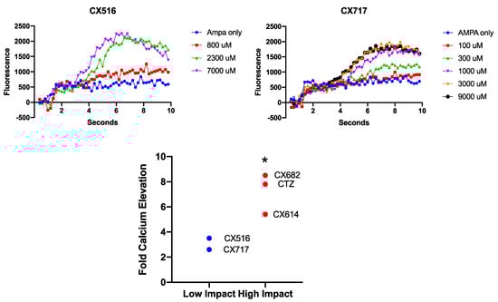 Effects of low-impact ampakines CX516 and CX717 on AMPA-induced calcium elevations in astrocytes. Graphs are representative of 2–3 independent experiments. Effects of low- and high-impact ampakines on AMPA-induced calcium elevation are listed and compared via student’s t-test. * p < 0.05 between high- and low-impact ampakines assessed in this study.