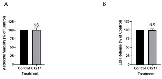 Effects of CX717 on cortical astrocyte viability. (A) Effects of 500 μM on cortical astrocyte viability using the XTT assay. (B) Effects of 500 μM CX717 on LDH release in astrocytes. Bars represent the mean ± SEM from 3–4 independent experiments. NS, Not significant, Student’s t-test.