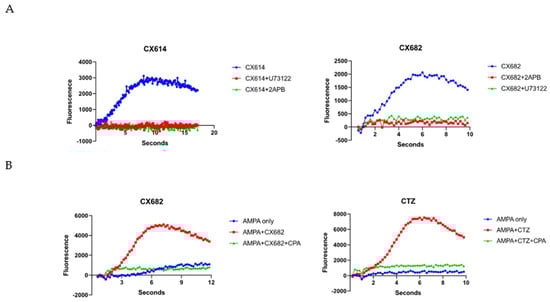 High-impact ampakine enhancement of calcium elevation is amenable to IP3 receptor antagonism and depletion of ER calcium stores. (A) CX614 and CX682 enhancement is amenable to PLC inhibitor U73122 and IP3 receptor antagonist 2-APB. (B) CX682 and CTZ enhancement is amenable to SERCA ATPase inhibitor CPA. Graphs are representative of at least three independent experiments.