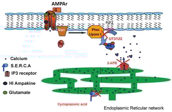 Ampakines as a drug class are classified as either high-impact or low-impact [13,38]. High-impact ampakines act specifically by binding the AMPAR tetrameric complex and stabilizing the glutamate-bound, open state confirmation, allowing for increased ion flux into the cell and offsetting desensitization [13,38,39,40,41]. Low-impact ampakines are thought to minimally affect receptor desensitization and agonist binding affinity, though they are believed to accelerate channel opening [13,26,38,42]. Recently, we found that high-impact ampakines induce a Gq-coupled inositol triphosphate (IP3) formation, which does not occur in the presence of the agonist alone in cortical neurons [43]. In addition to agonist-induced elevations of cytosolic calcium, a secondary cytosolic calcium elevation results from IP3-mediated endoplasmic reticular (ER) calcium liberation. This effect could be abrogated by pre-treating neuronal cultures with IP3 receptor and phospholipase C antagonists. Furthermore, this secondary mechanism is partially responsible for the ampakine-mediated enhancement of synaptic transmission in hippocampal slices [43].