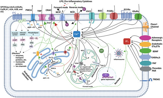 Microglia orchestrate calcium ion balance, signaling, and function via calcium channels, pumps, and exchangers that serve as portals for Ca2+ to enter or exit the cells and preserve intracellular Ca2+ (iCa2+) homeostasis [18]. The microglial Ca2+ channels include store-operated Ca2+ entry (SOCE), transient receptor potentials (TRP), and voltage-gated Ca2+ channels (VGCCs), allowing Ca2+ to enter the cell. Ca2+ extrusion from the cell occurs mainly through the Ca2+-ATPase and the Na+/Ca2+ exchanger (NCX) proteins.