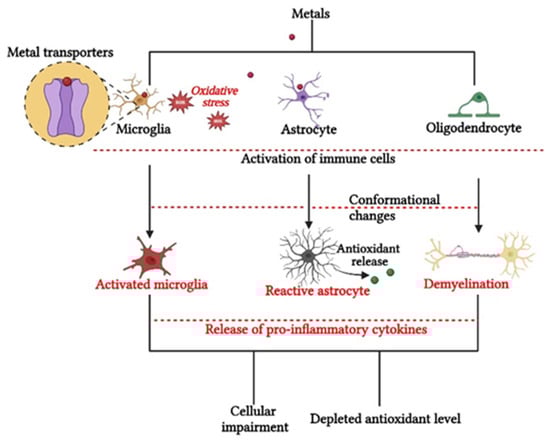 - Martínez-Hernández, M.I.; Acosta-Saavedra, L.C.; Hernández-Kelly, L.C.; Loaeza-Loaeza, J.; Ortega, A. Microglial activation in metal neurotoxicity: Impact in neurodegenerative diseases. BioMed Res. Int. 2023, 2023, 7389508. [Google Scholar] [CrossRef]