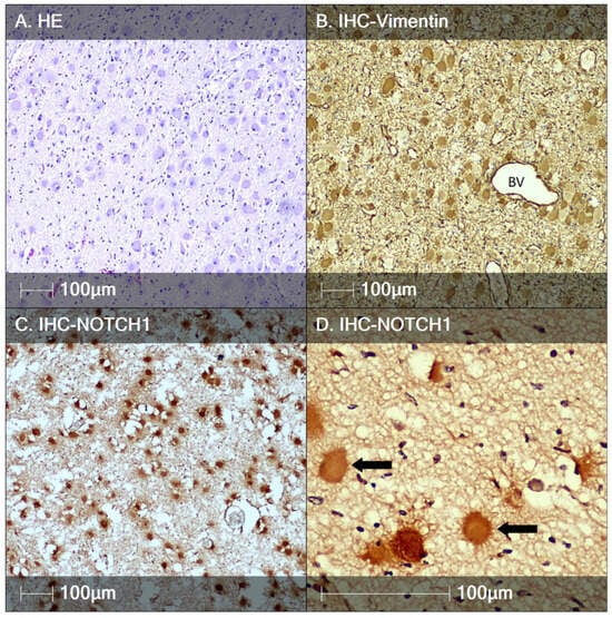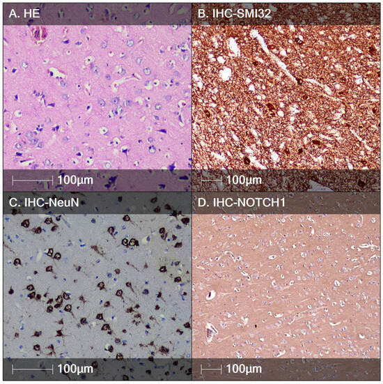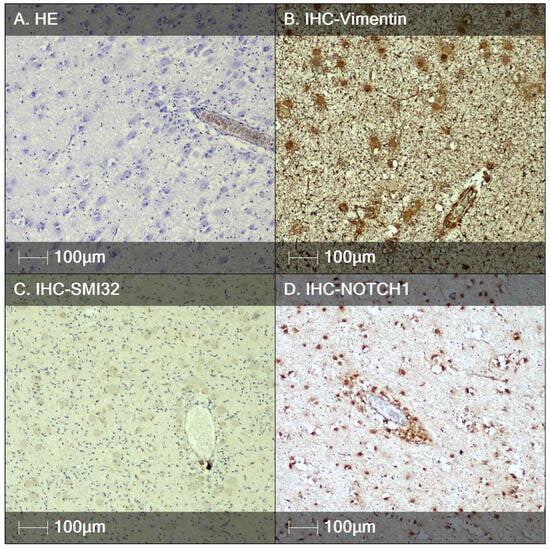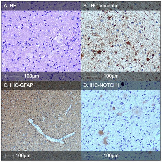 To evaluate their histopathological features and the potential stem-like cell populations involved in the pathogenesis of these lesions, tissue samples from these lesions were stained using the following IHC markers: Neurofilament protein (to identify neurons and assess their integrity), Vimentin (to stain glial and balloon cells and identify reactive astrocytes), S-100 protein (to visualize astrocytic cells and certain glial cells), NeuN (to label mature neurons and assess neuronal differentiation), CD34 (to mark endothelial cells), GFAP (to assess astrocyte activation and gliosis), and, finally, Notch-1 (a stem cell marker used to identify stem-like or undifferentiated cells). An established IHC protocol was employed []. Briefly, brain specimens were fixed in 10% formalin for 24 h at room temperature, after which they were dehydrated in graded ethanol, cleared in xylene, embedded in paraffin, and sectioned at 4 µm using a microtome. Tissue sections were deparaffinized by immersion in xylene and rehydrated. After epitope retrieval, blocking of endogenous peroxidase activity, and non-specific binding, sections were incubated overnight at 4 °C with the following primary antibodies: Anti-Neurofilament protein (clone SMI32): mouse monoclonal antibody (ready-to-use; Zeta Corp.; cat# Z2091MP, Sierra Madre, CA, USA); Anti-Vimentin (clone V9): mouse monoclonal antibody (ready-to-use; Dako; cat# IR630, Santa Clara, CA, USA); Anti-S100: rabbit polyclonal antibody (ready-to-use; Dako, cat# IR504, Santa Clara, CA, USA); Anti-NeuN (clone A60): mouse monoclonal antibody (ready-to-use; Zeta Corp.; cat# Z2178MP, Sierra Madre, CA, USA); Anti-Human CD34 (clone QBEnd/10): mouse monoclonal antibody (ready-to—use; Dako, cat# IR632, Santa Clara, CA, USA); Anti-GFAP (clone EP672Y): rabbit monoclonal antibody (ready-to-use, Cell Marque, cat# 258R-28, Rocklin, CA, USA); and Notch-1: rabbit polyclonal antibody, (1:200; Elabscience; cat# E-AB-12815, Wuhan, China). After washing, the sections were incubated with appropriate biotinylated secondary antibodies—goat anti-mouse (ready-to-use, Merck, cat# 21538-M, Darmstadt, Hesse, Germany) or goat anti-rabbit IgG (ready-to-use, Merck, cat# 21537, Darmstadt, Hesse, Germany) for 30 min at room temperature. The chromogen DAB was used for visualization and slides were counterstained with hematoxylin (ready-to-use, Leica Biosystems, cat#AR9915, Nussloch, Germany).