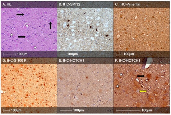 FCD type IIb. (A) HE staining showing DNs with enlarged cell bodies and nuclei and aggregated Nissl substance (black arrows) and balloon cells (white stars); (B) characteristic immunostaining of DNs positive for SMI32 and SMI32-negative large round BCs; (C) Vimentin-positive DNs; (D) DNs positive for S-100 protein; (E) BCs positive for the marker Notch-1, IHC staining; (F) higher-magnification Notch-1 IHC staining showing positively marked balloon (white star) and spider-like cells (black arrow), but not dysmorphic neurons (yellow arrow).