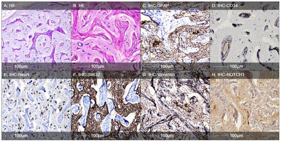The only case of meningioangiomatosis in our series was diagnosed in a 14-year-old patient. The lesion was localized in the temporal lobe. Clinically, it manifested as pharmacoresistant epilepsy. Histologically, the tumor-like formation was represented by meningiovascular proliferation—perivascularly located spindle cells and neurofibrillary tangles (Figure 6A,B). CD34 marked the endothelial cells of the vessels (Figure 6D). There were no signs of increased proliferative activity. Among the described meningiendothelial proliferations, there were cells with a morphology resembling that of DNs and cells with an intermediate phenotype in cases of FCD type IIb. The dysmorphic cells were positive for the markers Neurofilament protein, GFAP, Vimentin, and NeuN (Figure 6C,E–G), which corresponds to a glio-neuronal precursor immunophenotype. A smaller spider-like cell type with multiple processes showed positive expression for the stem cell biomarker Notch-1 (Figure 6H).