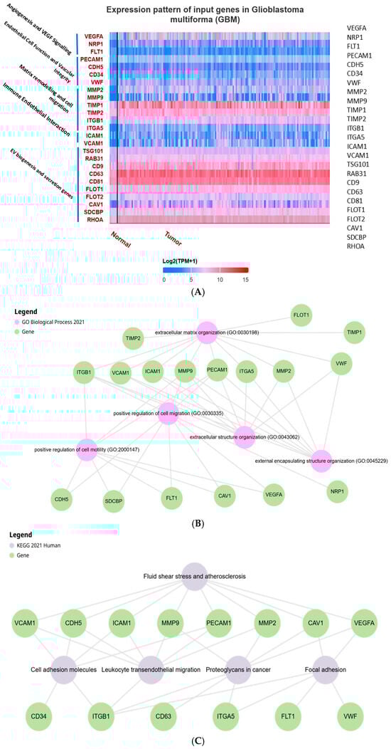 Gene expression, functional networks, and mechanisms in GBM-associated angiogenesis and EV biogenesis. (A) Heatmap showing expression patterns of genes involved in angiogenesis and extracellular vesicle (EV) biogenesis in glioblastoma multiforme (GBM). Gene expression levels are presented as Log2(TPM + 1), with blue indicating low and red high expression. Columns represent samples, with normal tissues on the left and GBM samples on the right. Angiogenesis-related genes (e.g., VEGFA, NRP1, MMP9) are in the top half, and EV-related genes (e.g., CD9, CD81, TSG101) are in the bottom half, highlighting differential expression between normal and tumor tissues. (B) Gene ontology (GO) network linking genes (green nodes) to biological processes (pink nodes) in GBM. Processes include “extracellular matrix organization” (GO:0030198), “cell motility” (GO:2000147), and “extracellular structure organization” (GO:0043062). Key genes like MMP9, ITGB1, and VEGFA are involved in multiple processes, underlining their roles in tumor progression and microenvironment remodeling. (C) Green nodes represent individual molecules, including integrins (ITGA5, ITGB1), vascular endothelial cadherins (CDH5), matrix metalloproteinases (MMP2, MMP9), and angiogenic mediators such as VEGFA and FLT1. Purple nodes represent overarching biological processes, including endothelial cell adhesion, vascular stress, angiogenesis, and ECM remodeling. The edges signify functional relationships, with green edges denoting direct, well-characterized interactions critical to endothelial cell function. This network underscores the mechanistic role of glioblastoma-derived EVs in perturbing endothelial cell signaling, contributing to abnormal angiogenesis and tumor vascularization.
