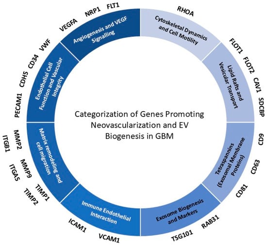 List of genes selected and categorized based on their role promoting neovascularization and involvement in EV biogenesis in GBM.