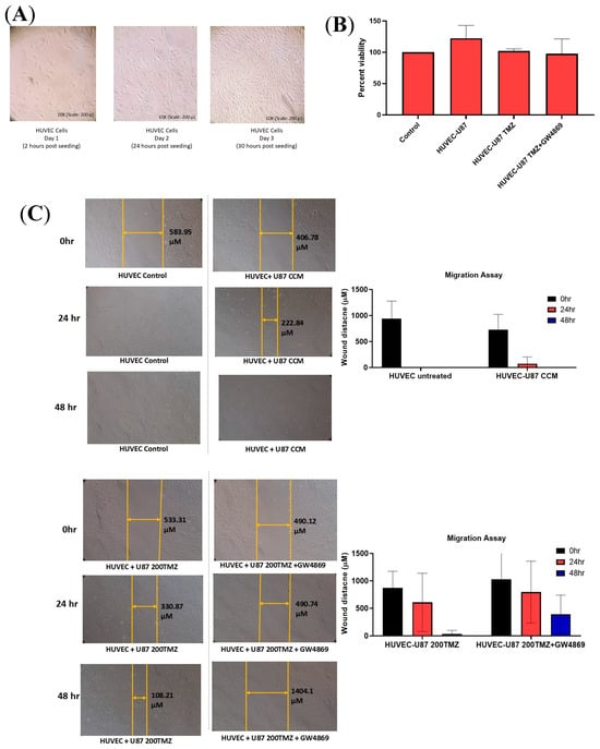 For the in vitro experiments, HUVEC cells were used to evaluate the biological effects of U87 MG-conditioned media. The experimental groups included U87 untreated, U87 + TMZ, and U87 + TMZ + GW4869. The cell viability assay was conducted by incubating HUVEC cells for 48 h with the respective conditioned media groups, followed by measurement of cell viability using standard protocols. The migration assay assessed cell migration after 48 h of exposure to conditioned media. All in vitro experiments were performed independently at least n = 3 times with appropriate biological and technical controls to ensure the reproducibility and robustness of the data.