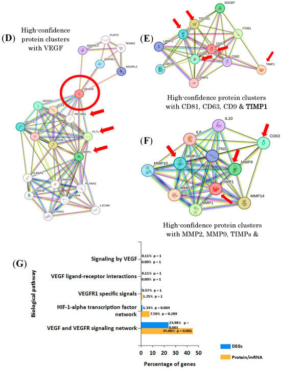 Protein–protein interaction network (PPIN) analysis identified VEGF as a central node, closely associated with PECAM1, NRP1, and FLT1, all critical players and known VEGF signaling receptors in angiogenesis (Figure 3D). Additionally, markers of EV biogenesis, such as TSG101 and the tetraspanins CD81 and CD63, demonstrated significant associations with TIMP1, suggesting a potential interface between EV-mediated communication and vascular remodeling (Figure 3E). Matrix metalloproteinases, including MMP9, were linked to EV pathways, further implicating EVs in extracellular matrix remodeling and angiogenic signaling (Figure 3F).