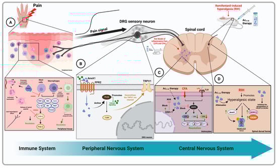 Crucially, these diverse actions of AnxA1 extend to the modulation of pain pathways. Several experimental studies have demonstrated that AnxA1, along with its N-terminal mimetic peptide Ac2–26, exerts potent antinociceptive effects in various pain models, including those induced by inflammation, tissue injury, viral infection, and opioid-induced hyperalgesia [5,6,7,8,9]. These effects are primarily mediated through the activation of the FPR2/ALX receptor, leading to the inhibition of pro-inflammatory signaling pathways, such as CXCL12/CXCR4 and TRPV1, the modulation of cytokine expression (e.g., TNF-α and IL-1β), and the promotion of resolution through macrophage reprogramming in the dorsal root ganglion (DRG). It is essential to note that AnxA1’s influence is not limited to peripheral mechanisms; it also acts centrally, in pain-processing regions such as the spinal cord, where it contributes to the regulation of neuronal excitability and attenuates central sensitization processes mediated by glial cells [4,10].