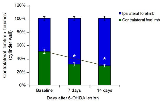 Effect of unilateral striatal 6-OHDA lesion on forelimb use asymmetry in the cylinder test. At PLD −1, animals exhibited a balanced use of both forelimbs. At PLD +7, a marked reduction in the use of the forelimb contralateral to the lesion was observed (31.04% of total touches), accompanied by a corresponding increase in ipsilateral forelimb use. This asymmetrical pattern persisted at PLD +14 (contralateral: 29.09% of total touches). Values expressed in percent. * p < 0.05; Student’s t-test, contralateral vs. lesioned striatum.