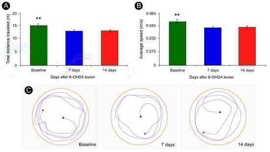 Behaviorally, the results of the cylinder test provided functional evidence of the lesion-induced motor deficits. While baseline assessments revealed symmetrical forelimb use, lesioned animals exhibited a progressive shift toward increased ipsilateral reliance and reduced contralateral support at both PLD +7- and +14. These findings are consistent with the partial depletion of dopaminergic innervation on the lesioned side, resulting in motor asymmetry, a hallmark of unilateral models of parkinsonism [21,28]. Similar behavioral alterations have been reported in studies employing the cylinder test to assess motor impairments following 6-OHDA lesions in the striatum, MFB, or SNpc [20,24,33]. Additionally, the open field test further corroborated the motor alterations induced by 6-OHDA injury, revealing significant motor impairments as evidenced by a reduced total distance traveled and lower average locomotor speed compared to baseline, as previously described [21].