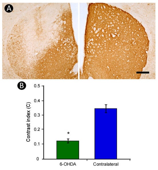 Striatal lesion induced by 6-OHDA. A marked loss of TH-immunoreactivity was observed in the lesioned striatum compared to the contralateral side (A), as confirmed by densitometric analysis (B). Scale bar: 500 µm. * p < 0.05; Student’s t-test, contralateral vs. lesioned striatum.