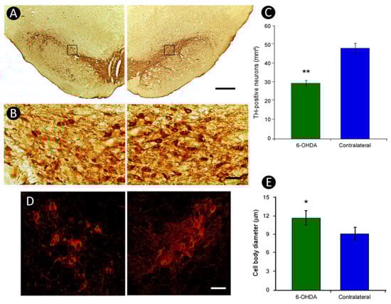 Effect of unilateral striatal 6-OHDA lesion on TH-positive neurons of Substantia Nigra pars compacta (SNpc). A reduction in TH-positive neurons and fibers was detected in the Substantia Nigra ipsilateral to the lesion, with no changes observed on the contralateral side (A,B), as further demonstrated by quantitative analysis (C). Additionally, TH-positive neurons on the lesioned side showed an increase of 28% in the size of their cell bodies as compared to the contralateral side (D,E). The squares in (A) indicates the region shown at higher magnification. Scale bars: 500 µm (A); 100 µm (B); 40 µm (D). * p < 0.05, ** p < 0.01; Student’s t-test, contralateral vs. lesioned striatum.