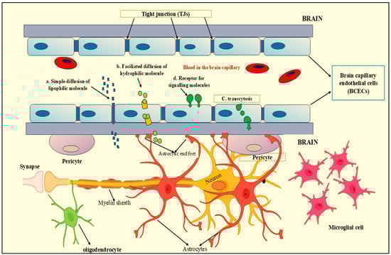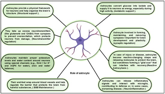 The macroglia, which include astrocytes, oligodendrocytes, and ependymal cells, and the microglia are the two categories of glial cells that are found in the central nervous system (CNS). The astrocyte is the subject of this review essay. Astrocytes possess significant physiological features that are associated with the maintenance of homeostasis in the central nervous system [35,36,37]. The release of neurotrophic factors is one of the ways astrocytes influence neuronal function. Astrocytes also play a role in the growth of neurons, facilitate the metabolism of neurotransmitters, and regulate the levels of extracellular potassium and pH [38]. Astrocytes have lately been recognized for their dynamic involvement in the regulation of neuronal function [39,40], a role previously unknown. It has been demonstrated, for instance, that astrocytes are necessary for the preservation of synapses in vitro and that they enhance the number of mature functional synapses on neurons in the central nervous system. The findings of this study indicate that astrocytes may play an active role in synaptic plasticity. Similarly, the removal of reactive astrocytes results in a significant amount of neuronal degeneration in the central nervous system of an adult who has been damaged [41]. The blood–brain barrier (BBB) is a structure that serves to limit the entry of blood-borne materials into the central nervous system (CNS) [17,42,43] (Figure 2).