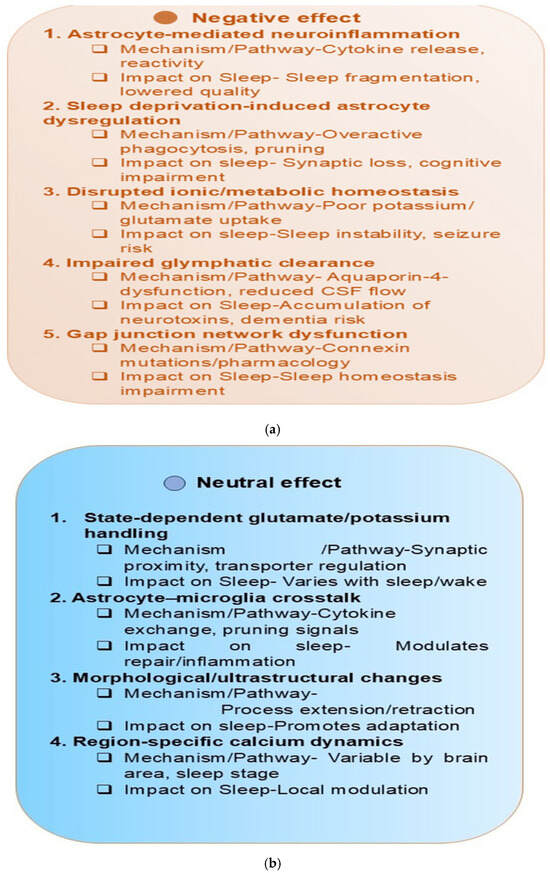 Astrocytes also play a role in the glymphatic system, which helps the brain get rid of waste while you sleep. This helps sleep do its restorative work and may even protect against neurodegenerative diseases. Astrocytes also control the size and makeup of the extracellular space, which affects how easily neurons fire and how well synapses work, both of which are important for sleep modulation. Sleep deprivation influences astrocytic gene expression and morphology, underscoring their adaptive response to modified sleep states. Recent studies underscore that astrocytic calcium signalling in particular brain regions, including the basal forebrain, regulates both non-REM and REM sleep by affecting local neural circuits and inhibitory neurons. The evolutionary preservation of astrocytic sleep mechanisms in both mammalian and invertebrate species underscores their essential function in sleep regulation [65,66,67,68] (Figure 4a,b).