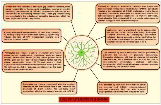 Brain ischemia begins when cerebral arteries are persistently obstructed by events such as cardiac arrest, ischemic stroke, or traumatic brain injury, leading to disrupted cerebral blood flow, oxygen and glucose deprivation, impaired ATP production, ion imbalance, excitotoxicity, and subsequent neuronal injury. One of the most noticeable and early reactions to anoxia-ischemia is astrocyte inflammation [106]. Additionally, the cytoplasm of these astrocytes has rougher endoplasmic reticulum and mitochondria, and the nuclei are larger and paler [107]. It is well recognized that astrocytes play a crucial role in the pathogenesis of ischemia [108]. However, little is known about how they react after a stroke and how they contribute to neuroprotection. Glial scar formation during ischemia severely impairs functional recovery and regeneration processes [109] (Figure 7).