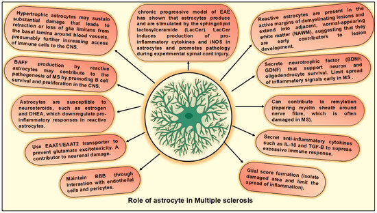 It is widely acknowledged that substances secreted by astrocytes are essential for the creation and maintenance of endothelial cells that constitute the blood–brain barrier (BBB). For instance, the activation of astrocytes by macrophage-derived IL-1 induces hypoxia-inducible factor-1 (HIF-1) and its target, vascular endothelial growth factor A (VEGF-A), in astrocytes. This, in turn, affects endothelial cells, leading to the down-regulation or loss of tight junction proteins claudin-5 (CLN5) and occludin, resulting in localized dysfunction of the blood–brain barrier (BBB) in damaged tissue, a process mediated by eNOS [123]. The inactivation of VEGF-A expression or the systemic selective inhibition of eNOS mitigates blood–brain barrier breakdown, diminishes lymphocyte infiltration and tissue damage, and safeguards against neurological deficits in experimental autoimmune encephalomyelitis (EAE) [124]. In addition to the tight connections on endothelial cells, astrocyte endfeet that constitute glia offer an extra barrier against autoreactive cellular activity in the central nervous system. Moreover, the disproportionate overexpression of matrix metalloproteinases (MMPs) in astrocytes and macrophages, in contrast to the stable expression or reduction of parenchymal basal membrane components, facilitates the dispersion of encephalitogenic cells into the central nervous system (CNS) [125]. It should be mentioned, too, that depending on the circumstances and the kind of MMP involved, extracellular matrix (ECM) remodelling can have both positive and negative effects. It is crucial to highlight the dual function of astrocytes, which includes fostering a permissive environment that encourages remyelination and assisting in axonal degeneration and demyelination. Therefore, a variety of factors, such as the type of lesion, the surrounding microenvironment, the timing of the injury, the interaction with other cell types, and factors influencing their activation, will determine the specific impact of astrocytes on the pathogenesis and repair of an inflammatory process [125].